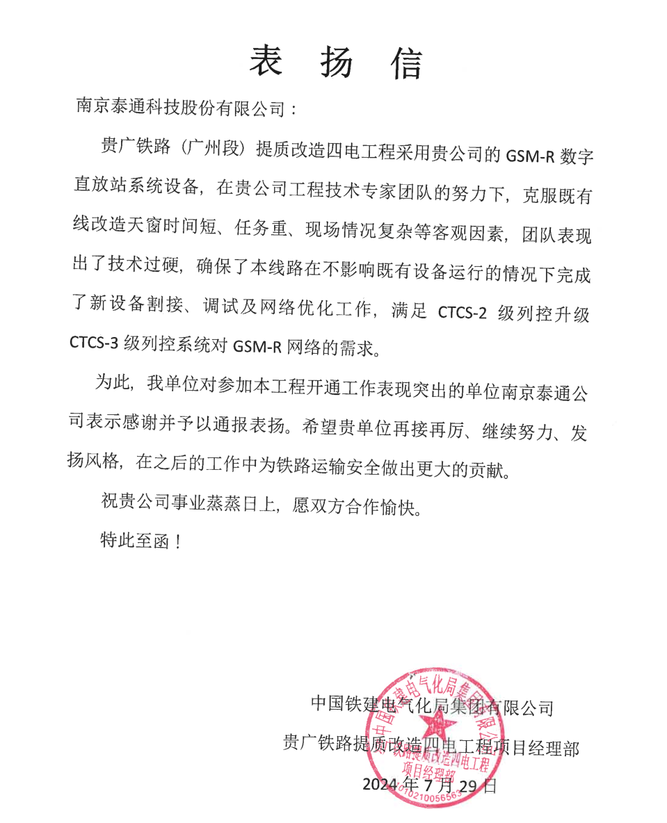 近日,泰通科技收到中國鐵建電氣化局集團有限公司發(fā)來的表揚信。信中對公司在貴廣鐵路(廣州段)提質(zhì)改造四電工程中出色的專業(yè)能力和高效的團隊協(xié)作表達(dá)了感謝,同時希望泰通科技再接再厲,在之后的工作中為鐵路運輸安全做出更大貢獻。