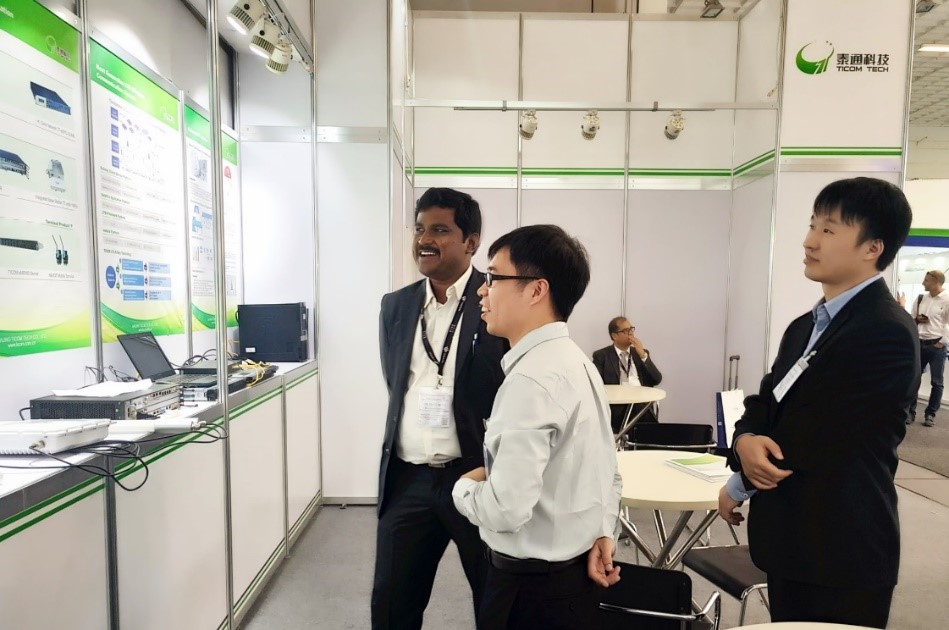 泰通科技董事長(zhǎng)吉榮新、總工程師陳建平與行業(yè)其他展商洽談